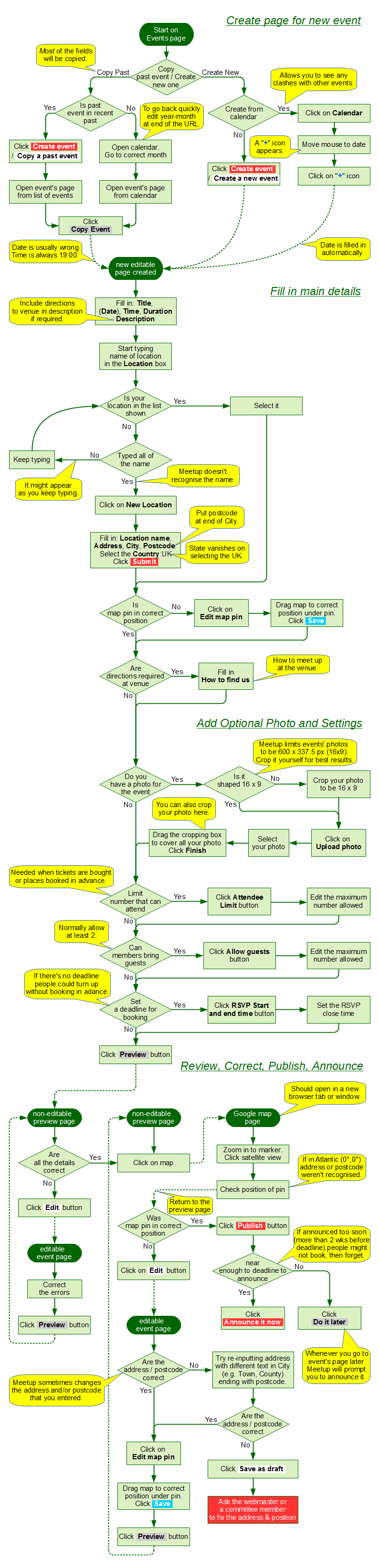 The flowchart below shows how to put an event on Meetup. It covers the recommended options, but not other less common ones such as repeat events, asking members questions, event fees, or adding or changing the event's Host. Follow a route through that's appropriate for your event, you won't need to do everything!